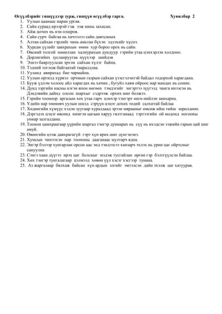 гишүүн өгүүлбэр гарга. Хувилбар 2 1. Уулын цаанаас наран ургав. 2. Сайн сураад ирээрэй гэж ээж минь захисан. 3. Айж цочих нь нэн олшров. 4. Сайн сурч байгаа нь хичээлээ сайн давтсаных 5. Алтан сайхан гэрлийг чинь амьтан бүхэн эдлэхийг хүснэ. 6. Хурсан үүлийг завхрахын өмнө хур бороо орох нь сайн. 7. Өвсний толгой намилзан халиурахын дундуур гэрийн утаа цэнхэрлэн холдоно. 8. Дорлигийнх зусланруугаа нүүхээр шийдэв 9. Эзнээ баярлуулсан эрхэм сайхан хүлэг байна. 10. Тэдний тоглож байгаатай тааралдлаа. 11. Ууланд авирахад бие чармайна. 12. Уулын оргилд хүрвэл орчмын газрын сайхан үзэсгэлэнтэй байдал тодорхой харагдана. 13. Бууж үдлэм холоос айл харагдах нь хачин , бугуйл хаям ойроос нар мандах нь сонин. 14. Дунд зэргийн насны нэгэн япон нөгөөх тэмдэгийг энгэртээ зүүгээд чанга инээсэн нь Дэндэвийн дайнд олсон шархыг сэдрээж орхих шиг болжээ. 15. Гэрийн тооноор аргалын хөх утаа гарч цэнхэр тэнгэрт өнгө нийлэн замхарна. 16. Үдийн нар төөнөвч уулын шилд сэрүүн цэцэг дохих төдий салхитай байлаа 17. Хөдөөгийн хүмүүс хэдэн зуугаар хуралдаад эрээн мярааныг өмсөж ийш тийш зөрөлдөнө. 18. Дэргэдэх цэцэг өвсөнд нимгэн цагаан хяруу гялтганаад тэртээгийн ой модонд ногооны униар залгалдана. 19. Тоонон цамхраагаар үүрийн шаргал тэнгэр дуниарах нь сүү нь ихэдсэн ээжийн гарын цай шиг амуй. 20. Өвөөгийн цээж давхрагагүй гэрт хүн ярих шиг дүнгэнэнэ. 21. Хумсын чинээхэн нар тоононы дааганаас мултарч ядна. 22. Энгэр бэлээр хунгарлан орсон цас энд тэндээсээ ханзарч эхлэх нь урин цаг ойртсныг сануулна 23. Сэнгэ хаан дүүгээ ирэх цаг болсныг мэдэж тусгайлан өргөө гэр бэлтгүүлсэн байлаа. 24. Хөх тэнгэр тунгалагаар цэлмээд хөвөн үүл хэсэг хэсгээр тунана. 25. Аз жаргалаар бялхаж байсан хүн ардын элгийг эмтэлсэн дайн эхэлж цаг хатуурав.