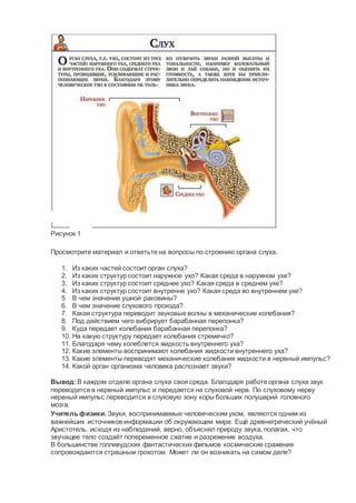 Документ описывает цели урока по физике и биологии, связанные с физиологией слуха и характеристиками звука, включая его строение, функции и физическую природу. В материале также рассматриваются эксперименты, которые демонстрируют распространение звуковых волн в различных средах, их характеристики, такие как высота, тембр и громкость, а также влияние шума на здоровье. Урок включает видеофрагменты и вопросы для проверки знаний об органах слуха и их механизмах.