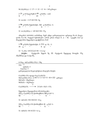 (Al2(SO4)3) = 2 . 27 + 3 . 32 + 12 . 16 = 342 გ/მოლი 2 გ Al რეაგირებს 3 გ H2SO4 – თან X “ “ “ 49 “ “ X= m (Al) = 2·27·49/3·98= 9გ 3 გ H2SO4 შეესაბამება 342 გ Al2(SO4)3 –ს 49 “ “ “ X “ “ X= m (Al2(SO4)3 ) =49·342/3·98= 57გ ამოცანის პირობის თანახმად, ჩვენ უნდა გამოვთვალოთ აგრეთვე H2-ის მოცუ- ლობა ნ.პ.-ში. რადგან ნებისმიერი აირის ერთი მოლი ნ. პ. – ში იკავებს 22,4 ლ მოცულობას, შეგვიძლია დავწეროთ, რომ 3 გ H2SO4 შეესაბამება 3 ლ H2 – ს 49 გ “ “ X ლ “ X= Vo (H2) =49·3·22,4/3·98 = 11,2 ლ პასუხი: რეაქციაში შედის 9გ Al. რეაქციის შედეგად მიიღება 57გ Al2(SO 4)3 და 11,2ლ H2. 4. მოც. m(Cu2(OH)2 CO3) = 50გ უ.გ. =? m(H2O) =? Vo(CO2) =? გამოვთვალოთ ნივთიერებათა მოლური მასები Cu 2(OH)2 CO3 იგივეა რაც Cu 2H2CO5 M(Cu2(OH)2 CO3) = 2 გ/მოლი M(CuO) = 80გ/მოლი M(H2O) = 18გ/მოლი to Cu 2(OH)2CO3 2 CuO + H2O + CO2 შეგვიძლია შევადგინოთ პროპორციები: 222 გ Cu2(OH)2 CO3 წარმოქმნის 2. 80 გ CuO -ს 50 “ “ “ X “ X= m(CuO) =50·2·80/222= 36 გ 222 გ Cu2(OH)2 CO3 წარმოქმნის 18 გ H2O -ს 50 “ “ “ X “ X= m(H2O) =50·18/222= 4,1 გ