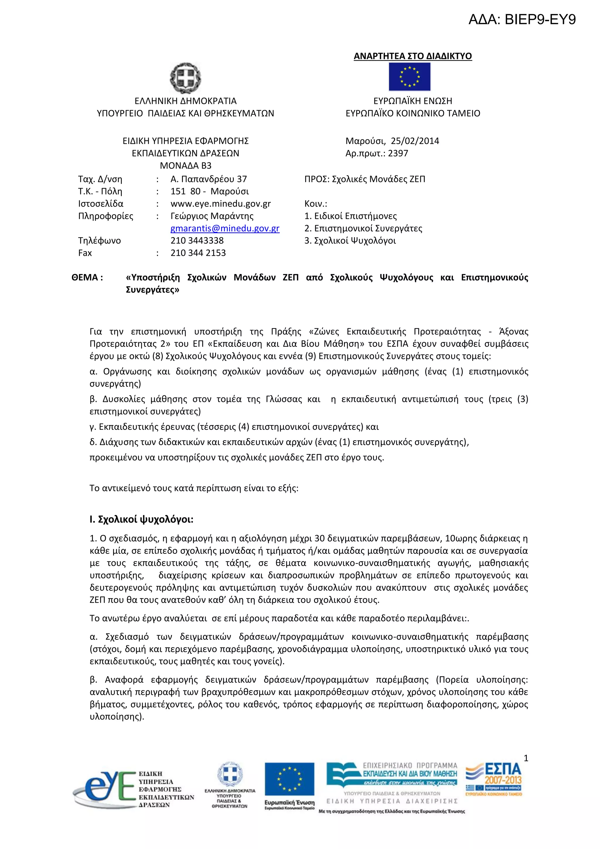 «Υποστήριξη Σχολικών Μονάδων ΖΕΠ από Σχολικούς Ψυχολόγους και Επιστημονικούς