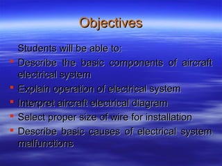 The document discusses aircraft electrical systems. It describes the basic components which include power sources like batteries and generators. Batteries provide power when other sources are unavailable while generators are driven by engines and convert mechanical to electrical energy. Modern systems use constant frequency integrated drive generators or variable speed constant frequency generators to produce steady DC or AC power. The electrical power is controlled and distributed to aircraft components and loads.