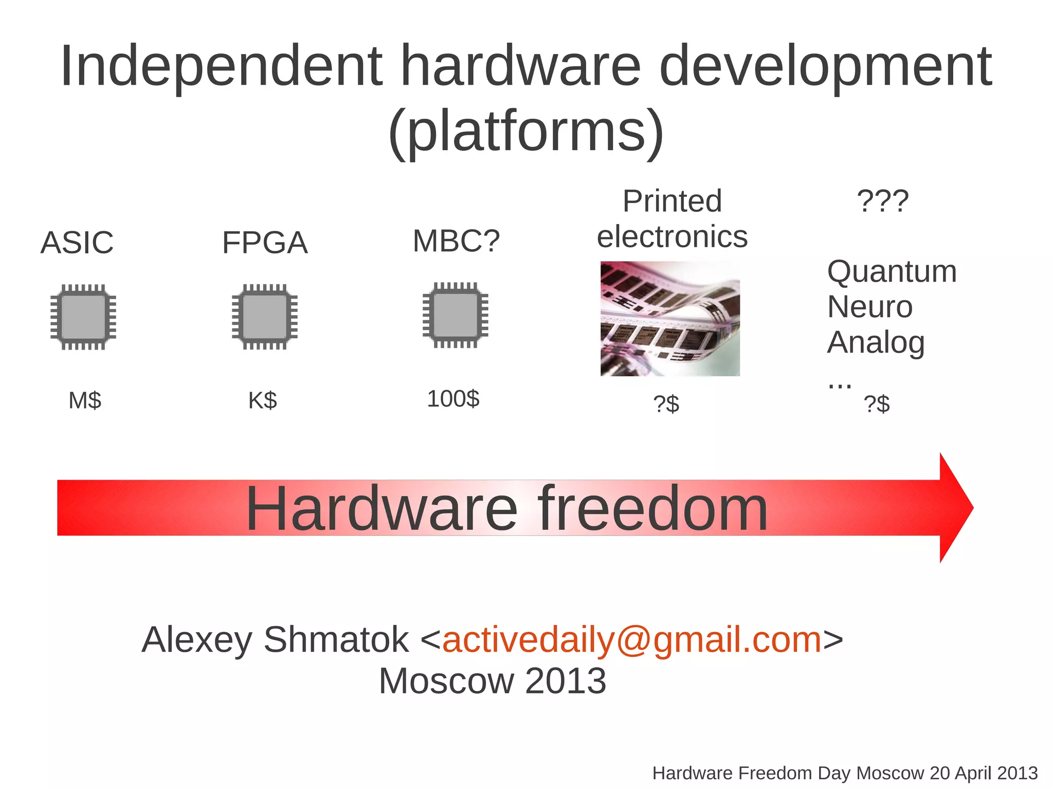 This document discusses various topics related to independent hardware development including FPGAs, printed electronics, memory-based computing, asynchronous vs synchronous design, and high-level synthesis. It also briefly mentions the DARPA SyNAPSE project which aims to develop neuromorphic computing systems inspired by biology. The document appears to be notes for a presentation on hardware freedom given at the Hardware Freedom Day event in Moscow in 2013.
