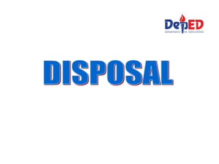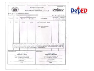 This document discusses government property management. It defines key terms like accountability, responsibility and liability. It outlines the different phases of property management including acquisition, utilization, and disposition. It describes the different modes of acquiring government property such as purchase, construction, transfer, donation. It provides details on topics like recording assets, inventory taking, relief from accountability for lost property, and disposal of unserviceable property. The document is a comprehensive reference on policies and procedures for managing government assets.