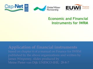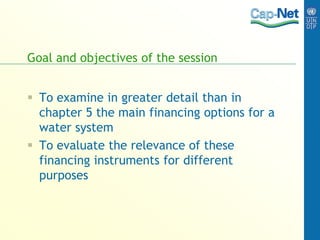 This document discusses various economic and financial instruments for integrated water resource management. It examines in detail the main financing options for water systems, including the pros and cons of each option and how they can be applied in different circumstances. The options covered include water and sewerage charges, government grants and loans, external grants such as development aid, philanthropic partnerships, commercial loans and bonds, and private equity. It also discusses how risk guarantees can be used to facilitate financing. The document provides examples of how these instruments have been applied to finance activities like flood risk management. It concludes by suggesting a role play exercise where participants negotiate a funding scheme between a central government and local authority to improve local access to water and sanitation.