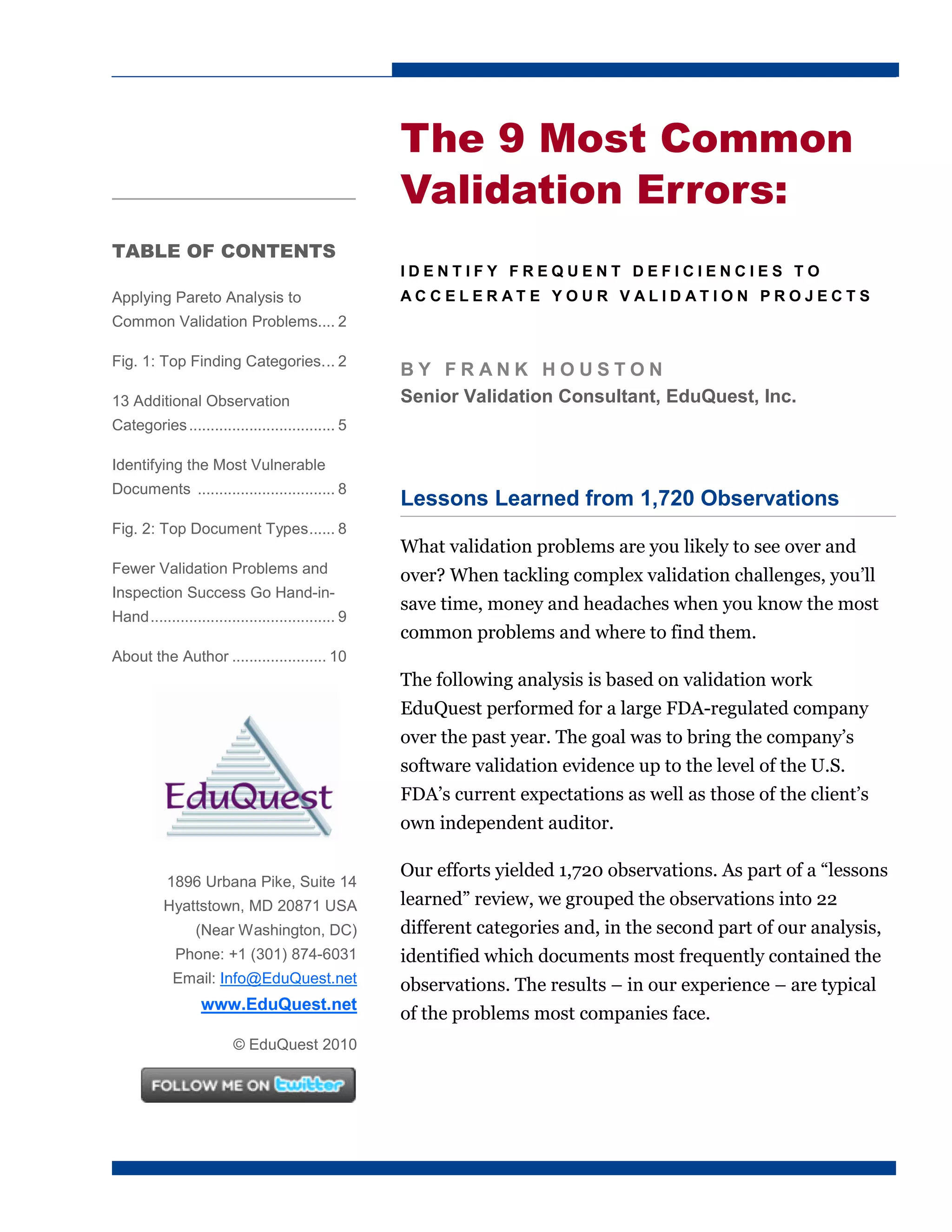 The document analyzes 1,720 validation observations from a project to identify common validation errors. The top nine most frequent errors were: missing information, inconsistency, lack of detail, traceability issues, vague wording, unverifiable test results, GDP issues, incomplete testing, and ambiguity. Specifications, test scripts, validation plans, test plans, trace matrices, and test results were the most vulnerable documents. Identifying and addressing common errors can help companies prepare for FDA inspections.