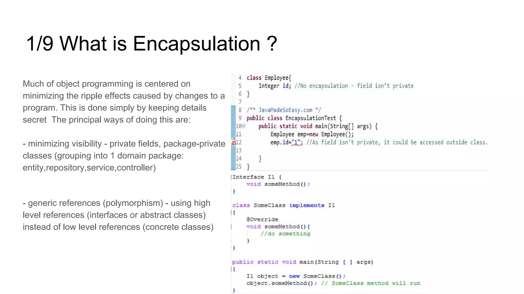 The document discusses key concepts in object-oriented programming, including encapsulation, polymorphism, aggregation, method overloading, and the differences between inheritance and composition. It emphasizes best practices like minimizing visibility, using dependency injection, and the importance of avoiding code duplication (DRY). Additionally, it touches on delegation and the Law of Demeter, urging a design that promotes loose coupling and easier testing.
