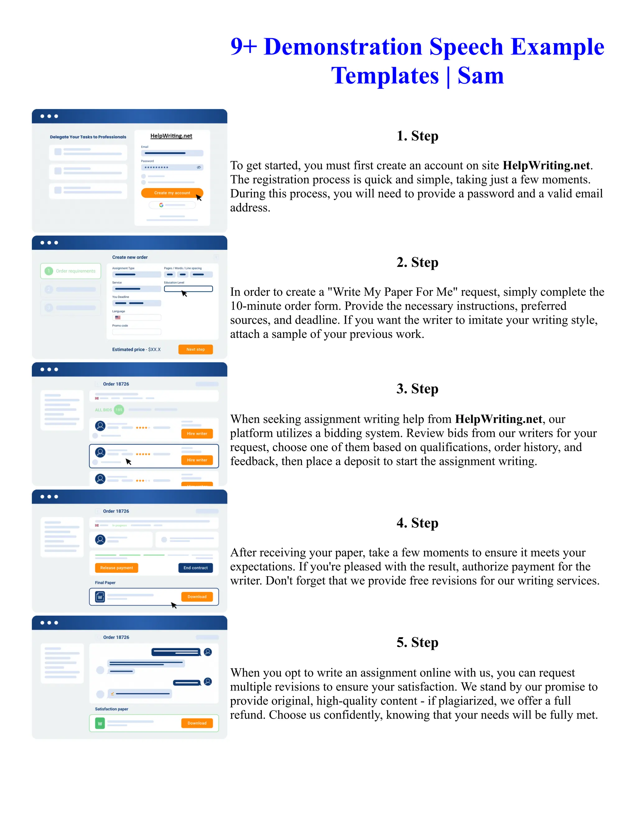 The document discusses the process of creating an account and placing an order on the HelpWriting.net website to request that a paper be written. It involves 5 steps: 1) Creating an account with an email and password. 2) Completing a 10-minute order form providing instructions, sources, and deadline. 3) Reviewing bids from writers and choosing one based on qualifications. 4) Reviewing the completed paper and authorizing payment if satisfied. 5) Being able to request revisions to ensure satisfaction, with a refund offered for plagiarized work.