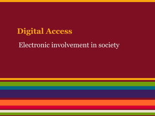 Digital citizenship involves 6 key areas: digital access, digital communication, digital commerce, digital literacy, digital security, and digital law. It is important that all people have access to technology and understand how to safely and legally participate in the digital world through email, social media, online shopping, and other online activities while respecting digital etiquette and the rights and well-being of others.