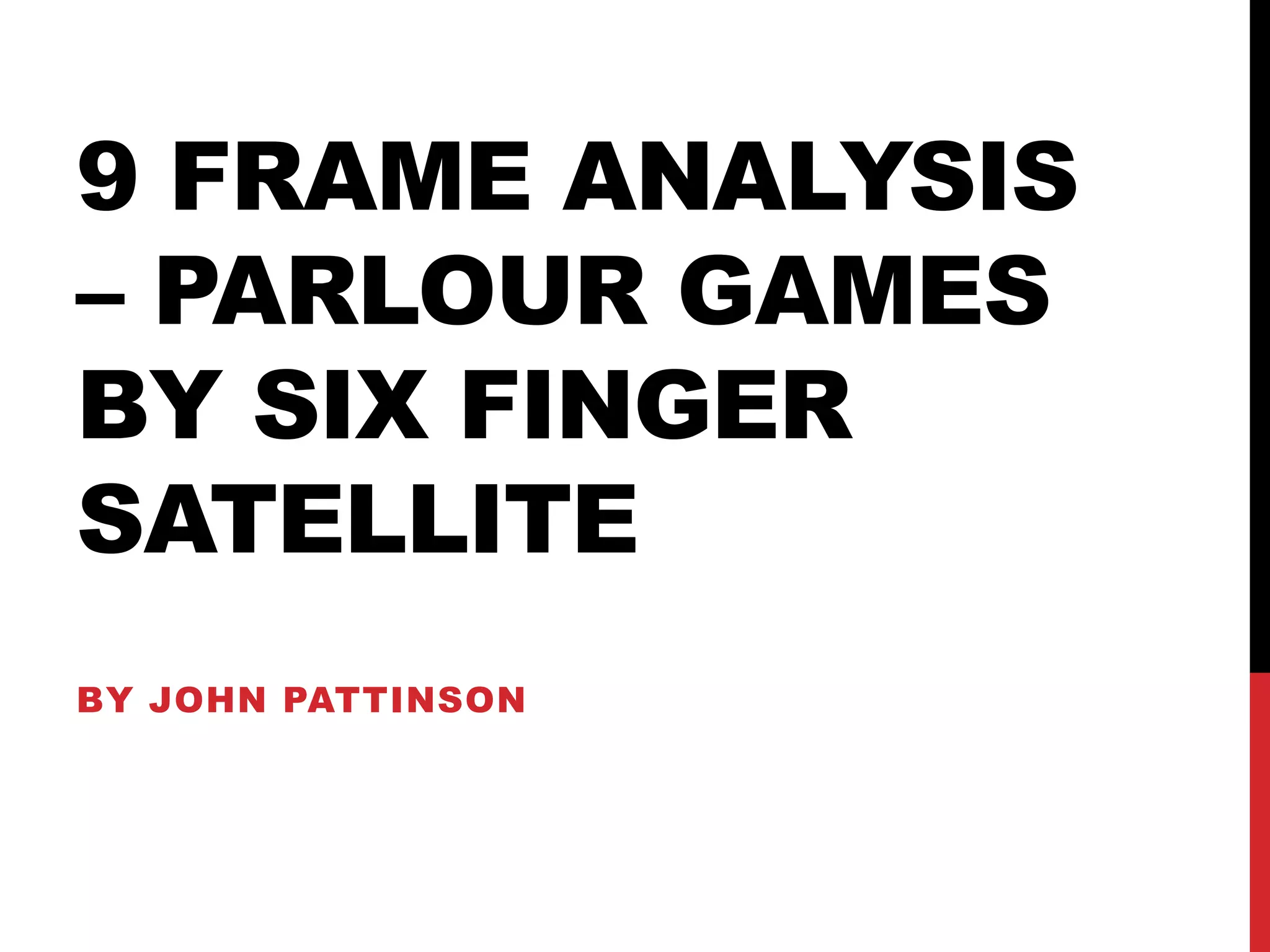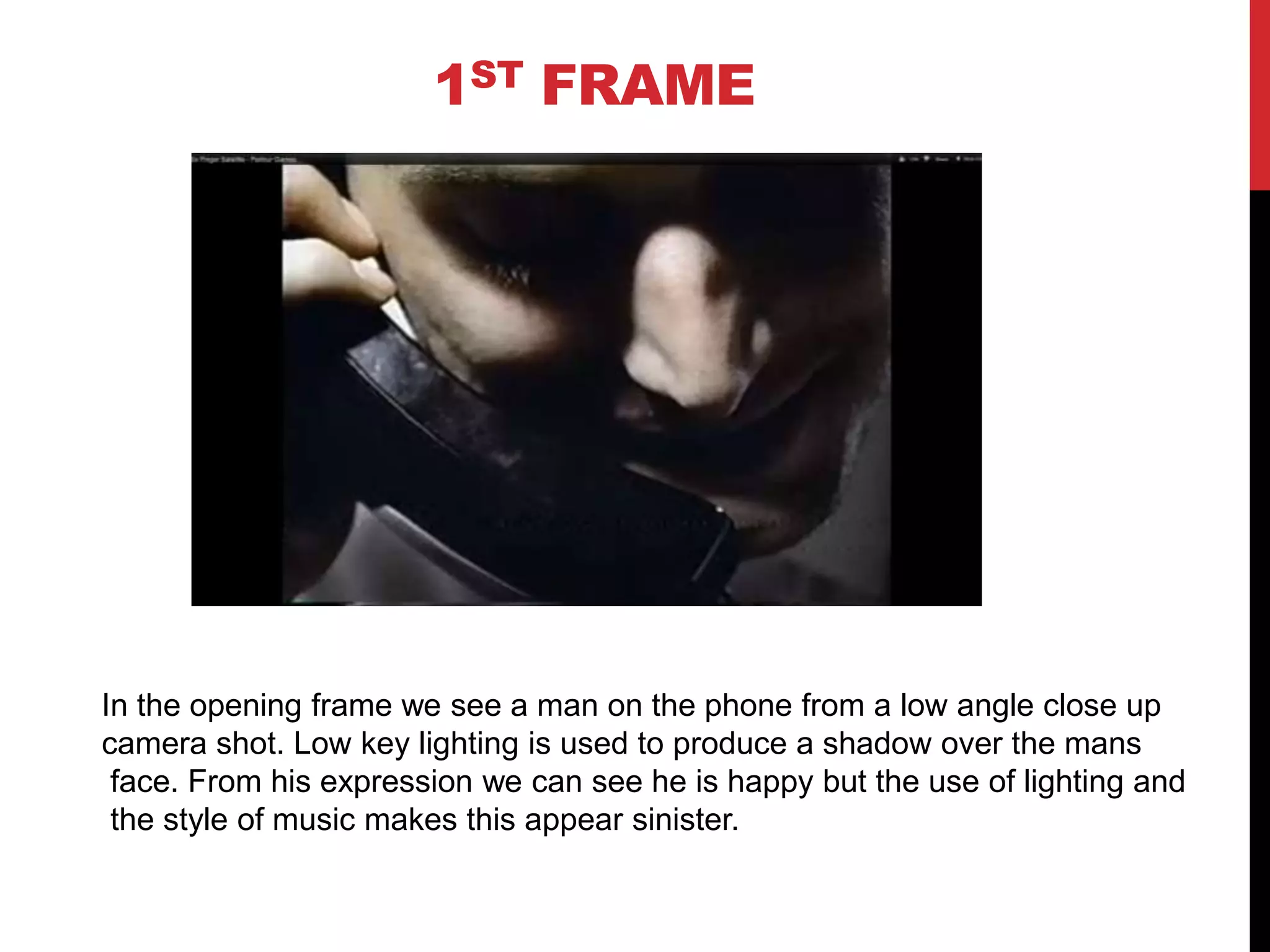 This document analyzes 9 frames from a music video. Each frame is summarized, noting camera angles, lighting techniques, and how they establish mood and provide insight into the characters. Low-key lighting and shadows are used frequently, creating a sinister or secretive tone. Extreme close-ups focus attention on faces and expressions. Breaking the fourth wall in one frame makes the audience unsettled. Overall the frames tell a story through their cinematography and mise-en-scene.