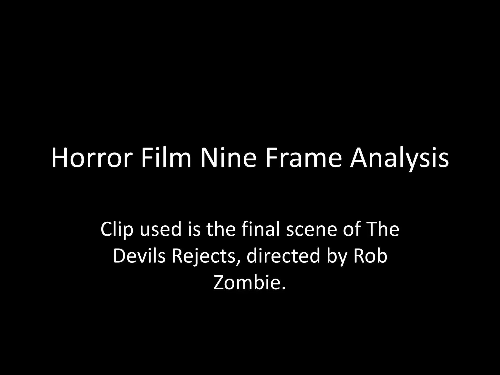 This nine frame analysis summarizes the final scene of the film The Devil's Rejects. It begins with the Devils Rejects driving through the desert, appearing free to escape. However, they are confronted by police officers setting up a barricade. Despite being outnumbered and injured, Otis loads a gun and the trio speeds toward the officers for a last stand fight. The scene uses lighting, editing, and shots of the characters' injuries to elicit sympathy for the criminals from the audience. It culminates with the Devils Rejects being shot repeatedly until they are destroyed, having fought until the end rather than surrender.