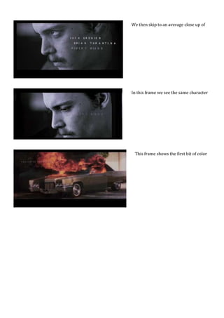 The document summarizes key frames from the opening sequence of the film "Donnie Brasco". It describes tense opening music with white text credits. The sequence then shows extreme close-ups of a man's eyes, a group of men in similar attire, and a stern-faced man surrounded by people, establishing him as an important mafia boss figure. Color is briefly introduced before returning to black and white for a final frame focusing on organized crime.