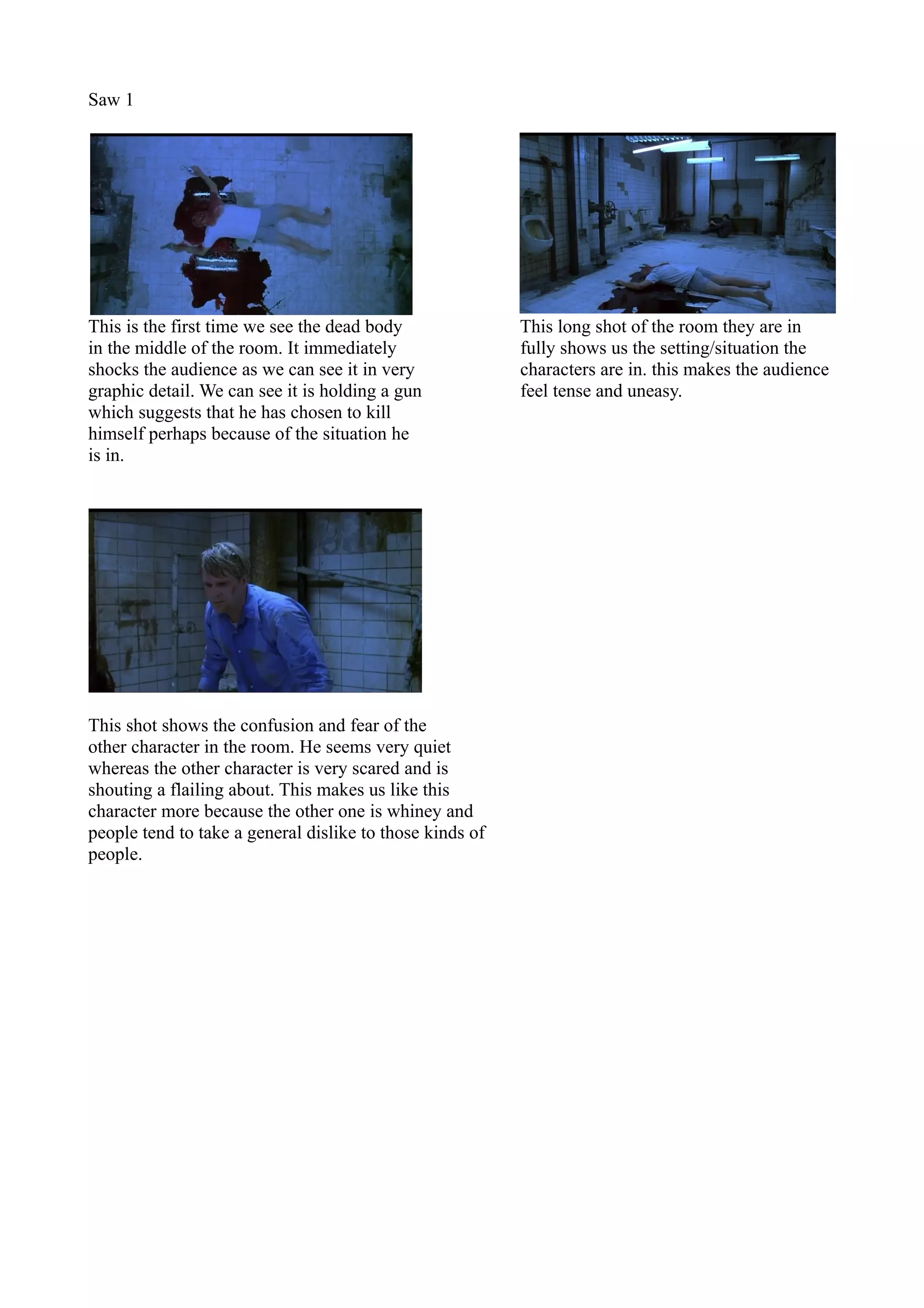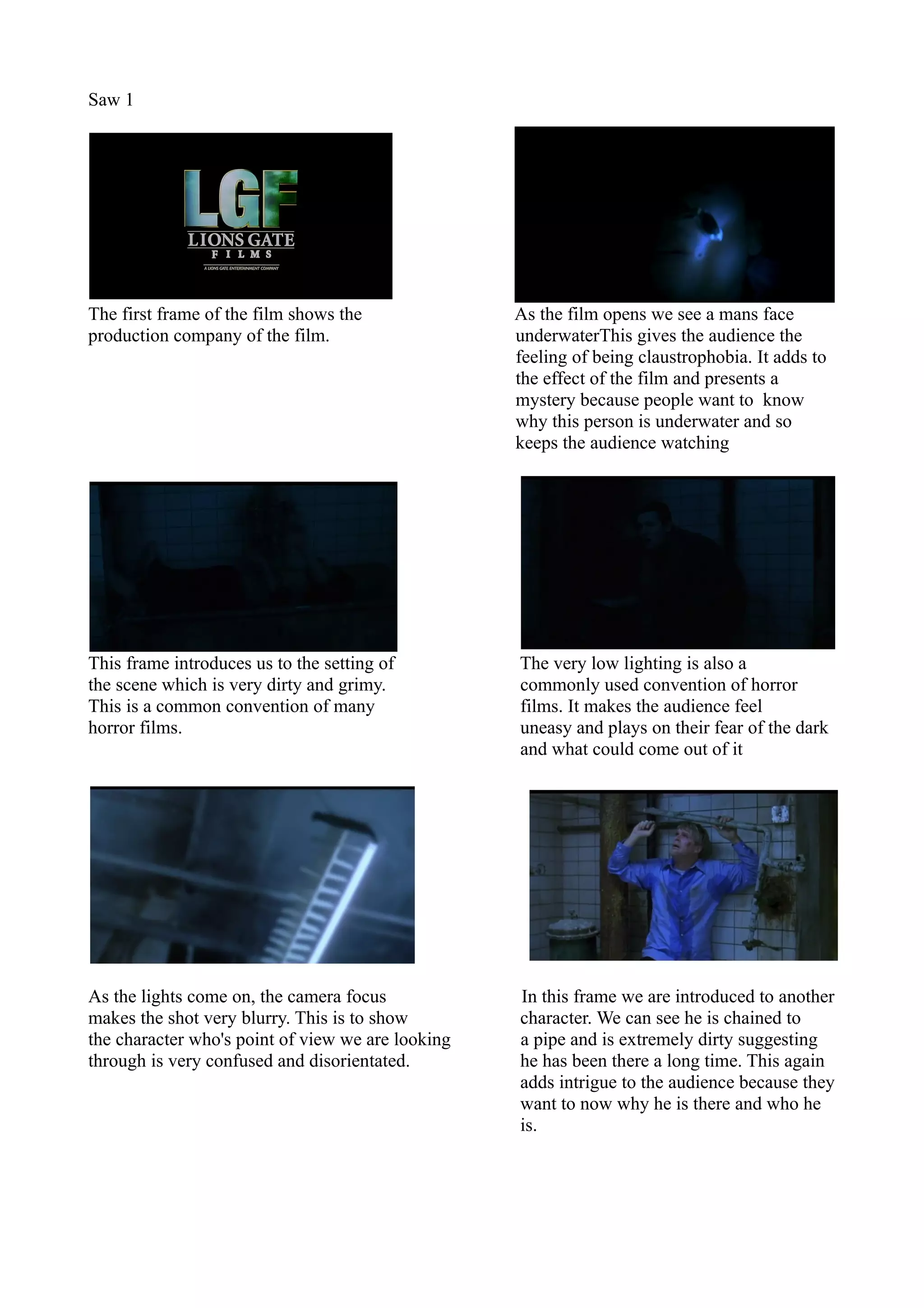 The document summarizes several key frames from the opening of the film Saw 1. The frames introduce the gritty setting, establish mystery through a character underwater and another chained up. Graphic imagery of a dead body shocks viewers. Shots also show the fear and confusion of the characters as they discover their dire circumstances, building tension and intrigue for the audience.