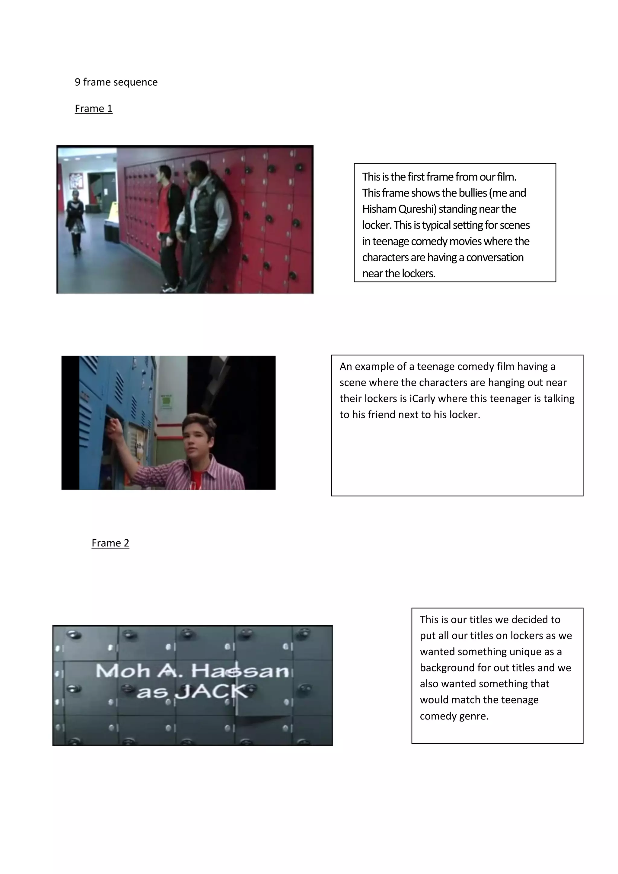 This 9 frame sequence from a student film shows the opening scenes establishing characters and conflict. Frame 1 introduces the main bullies near school lockers. Frame 2 displays the title on lockers, matching the teenage comedy genre. Frame 3 establishes the main character Jack as a nerdy outcast. Frame 4 depicts a funny scene of a character getting slapped. Frame 5 reveals the film's title focusing on Jack learning to stand up for himself. Frames 6-7 showcase the bullies pushing Jack around. Frame 8 presents a chase scene. Frame 9 closes on the bullies' titles on a locker, similar to earlier frames.
