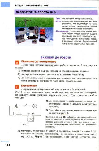 1919 Лабораторна робота № 1 Вказівкидо роботи    Підготовка до експерименту 1. Перш ніж виконувати роботу, переконайтеся, що ви знаєте відпо- віді на такі запитання. 1)  Що називають електризацією? 2)  Заряд із яким знаком має ебонітова паличка, потерта об ­вовну? 3)  Заряд із яким знаком має паличка з оргскла, потерта об ­папір? 2. Прив’яжіть шовкові нитки до одної палички з оргскла та одної ебонітової палички і  закріпіть нитки в  лапках штатива.    Експеримент 1. Дослідіть взаємодію заряджених тіл. Для цього виконайте такі  дії. 1)  Зарядіть обидві ебонітові палички, потерши їх об вовну чи хутро. Повільно піднесіть ебонітову паличку до ебонітової па- лички, підвішеної на нитці. Опишіть та поясніть спостережуване ­явище. 2)  Зарядіть обидві палички з оргскла, потерши їх об папір. По- вільно піднесіть паличку з оргскла до такої ж палички, підвішеної на нитці. Опишіть та поясніть спостережуване явище. 3)  Повільно піднесіть до зарядженої палички з оргскла, підвішеної на нитці, заряджену ебонітову паличку. Опишіть та поясніть спо- стережуване явище. 4) Наелектризуйте надуті повітряні кулі тертям об вовну чи хутро. 5)  Візьміть кулі за нитки, розташуйте їх на одному рівні. Повіль- но піднесіть кулі одна до одної. Опишіть та поясніть спостережу- ване ­явище. 2. Дослідіть взаємодію зарядженого і незарядженого тіл. Для цього виконайте такі дії. 1)  Піднесіть заряджену повітряну кулю до дрібно нарізаного па- перу. Поясніть спостережуване явище. 2)  Легенько притисніть до стінки заряджену кулю і відпустіть. Поясніть спостережуване явище.  Аналіз експерименту та його результатів Проаналізуйте результати експерименту, зробіть висновок про характер взаємодії однойменно та різнойменно заряджених тіл, а та- кож зарядженого та незарядженого тіл. + Творче завдання Дослідіть залежність сили взаємодії заряджених тіл від модулів їхніх зарядів. Скористайтеся двома невеликими кульками діаметром близько 2  см, виготовленими зі  шматочків повітряної кулі й натертими графітовою стружкою до металевого блиску. Запишіть план проведення досліду.