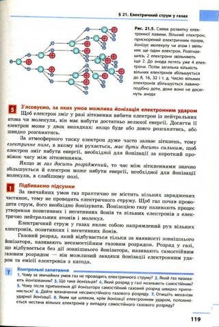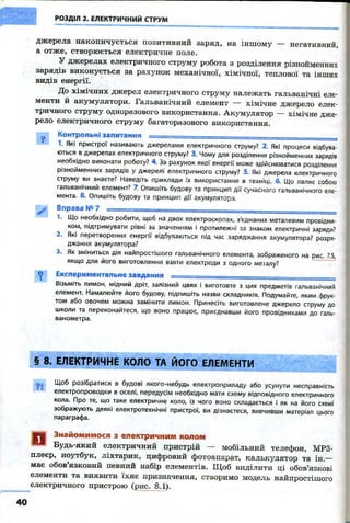 2727 ЗАВДАННЯ ДЛЯ САМОПЕРЕВІРКИЗА РОЗДІЛОМ 1 г) під дією електричного поля на ближчих до палички частинах клап- тиків паперу утворюється негативний заряд.   6. (2 бали) Чому дрібні крапельки одеколону, який розприскується пульверизатором, виявляються наелектризованими?   7. (2 бали) Чому розряджається електроскоп, якщо доторкнутися ру- кою до його кондуктора?   8. (2 бали) Чи можна під час електризації тертям зарядити тільки одне зі стичних тіл? Відповідь обґрунтуйте.   9. (2 бали) На тонких шовкових нитках підвішені дві однакові легенькі паперові гільзи. Одна з них заряджена, а друга — ні. Як визначити, яка з  гільз є  зарядженою? 10. (2 бали) Як за допомогою позитивно зарядженої металевої кульки зарядити негативно таку саму кульку, не збільшуючи та не змен- шуючи заряду першої кульки? (У завданнях 11–15 електричні заряди вважати нерухомими точковими.) 11. (3 бали) При зміні відстані між двома електричними зарядами сила їхньої взаємодії зменшилася в  16 разів. Як змінилася відстань між зарядами? 12. (3 бали) Як зміниться сила взаємодії двох електричних зарядів при збільшенні модуля кожного з  них у  3 рази? 13. (4 бали) Дві позитивно заряджені кульки взаємодіють у  вакуумі із силою 0,1  Н. Відстань між ними дорівнює 6  см. Заряд одної з  ку- льок становить 2 ⋅ 10–5 Кл. Обчисліть заряд іншої. 14. (5 балів) Два негативно заряджених тіла відштовхуються із силою 0,9  Н. Відстань між тілами дорівнює 8 см. Визначте кількість над- лишкових електронів в  одному з тіл, якщо заряд іншого становить –4 мкКл. 15. (6 балів) Кульку, що є  провідником і  несе заряд 1 8 10 8 , ⋅ −   Кл, од- ночасно привели у  дотик з  двома такими самими кульками, одна з  яких має заряд − ⋅ − 0 3 10 8 , Кл, а  друга є незарядженою. Обчисліть заряд кожної кульки після дотику. З  якою силою взаємодіятимуть після дотику дві з  цих кульок на відстані 5 см одна від одної? Звірте ваші відповіді на завдання з наведеними в  кінці підручника. Позначте завдання, які ви виконали правильно, і  полічіть суму балів. ­Потім цю суму розділіть на три. Одержане число відповідатиме рівню ваших навчальних досягнень.