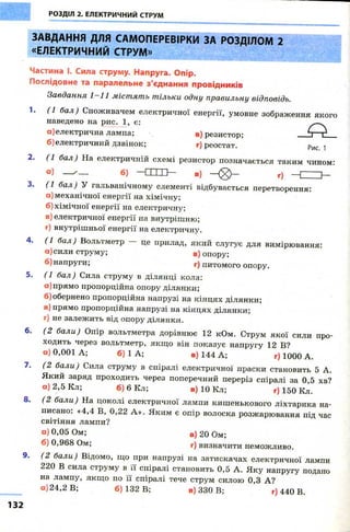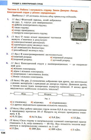 26 РОЗДІЛ 1. ЕЛЕКТРИЧНЕПОЛЕ ЗАВДАННЯ ДЛЯ САМОПЕРЕВІРКИ ЗА РОЗДІЛОМ 1 «ЕЛЕКТРИЧНЕ ПОЛЕ» 1. (1 бал) Які частинки, що входять до складу атомного ядра, мають позитивний заряд? а) тільки протони; б) тільки електрони; в) тільки нейтрони; г) протони й нейтрони. 2. (1 бал) У  якому випадку нейтральний атом перетворюється на по- зитивний йон? а) якщо атом втрачає один або кілька протонів; б) приєднує один або кілька нейтронів; в) приєднує один або кілька електронів; г) втрачає один або кілька електронів. 3. (1 бал) На рис. 1–3 зображено три пари легких кульок, підвішених на шовкових нитках. На якому з  рисунків зображено кульки, за- ряджені однойменними зарядами? а) 1;  б) 2;  в) 3;  г) такого рисунка немає. Рис. 3Рис. 1 Рис. 2 4. (1 бал) У  ядрі атома Літію втримується 7 частинок, навколо ядра рухаються 3 електрони. Скільки в  ядрі цього атома протонів і  ней- тронів? а) 3 протони та 4 нейтрони; б) 4 протони та 3 нейтрони; в) тільки 7 протонів; г) тільки 7 нейтронів. 5. (1 бал) Ебонітова паличка, потерта об натуральне хутро, заряджа- ється негативно й починає притягувати легкі клаптики паперу. Чим це пояснюється? а) клаптики паперу заряджаються негативно; б) клаптики паперу заряджаються позитивно; в) під дією електричного поля на ближчих до палички частинах клап- тиків паперу утворюється позитивний заряд;