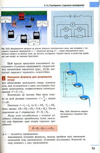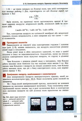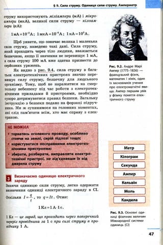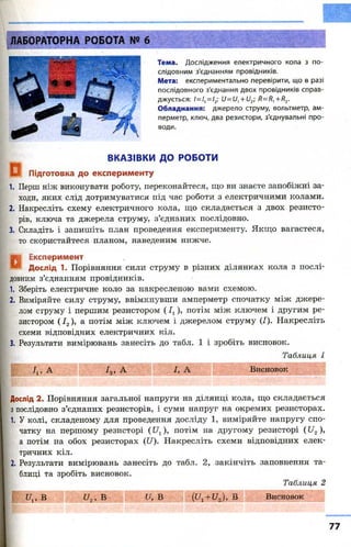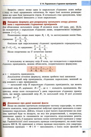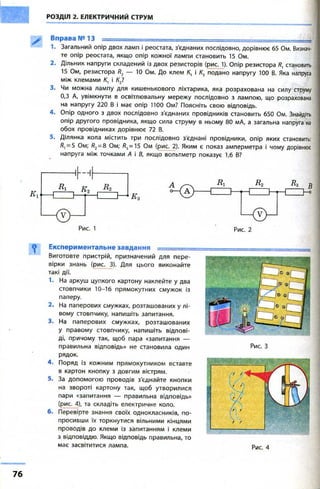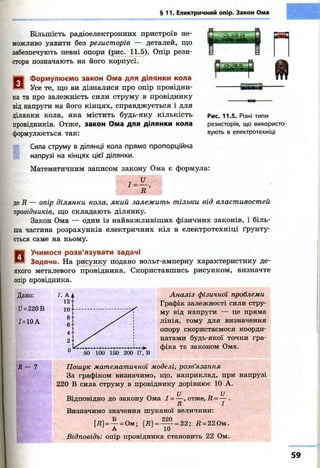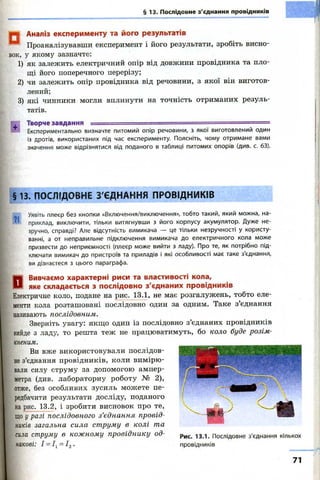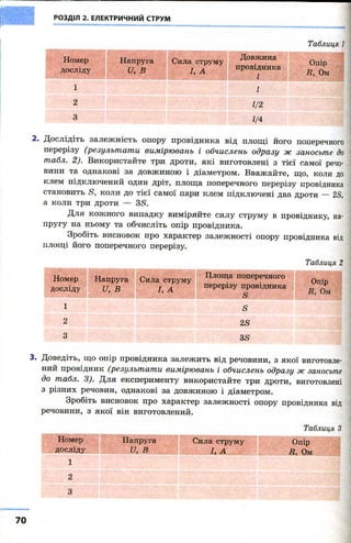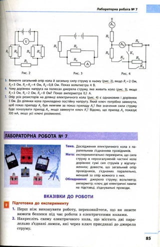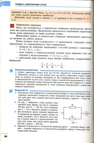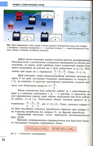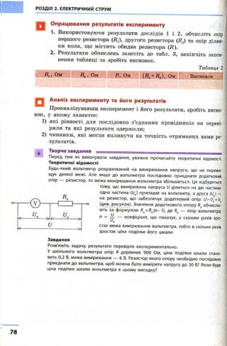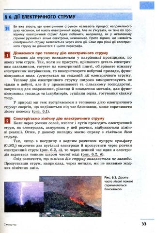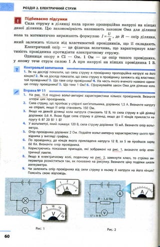 222 ЗМІСТ Розділ 1. Eлектричнеполе   § 1. Заряд і електромагнітна взаємодія. . . . . . . . . . . . . . . . . . . . . . . . . . . . . . . 4   § 2. Електричне поле. Взаємодія заряджених тіл. . . . . . . . . . . . . . . . . . . . . . . 8   § 3. Механізм електризації. Електроскоп. . . . . . . . . . . . . . . . . . . . . . . . . . . . 12   Лабораторна робота № 1. . . . . . . . . . . . . . . . . . . . . . . . . . . . . . . . . . . . . 18   § 4. Закон Кулона . . . . . . . . . . . . . . . . . . . . . . . . . . . . . . . . . . . . . . . . . . . . . . . 20 Підбиваємо підсумки розділу 1 «Електричне поле» . . . . . . . . . . . . . . . . . . . . 24 Завдання для самоперевірки за розділом 1 «Електричне поле». . . . . . . . . . . 26 Енциклопедична сторінка. . . . . . . . . . . . . . . . . . . . . . . . . . . . . . . . . . . . . . . . . . 28 Розділ 2. Електричний струм   § 5. Електричний струм. Електрична провідність матеріалів. . . . . . . . . . . . 30   § 6. Дії електричного струму . . . . . . . . . . . . . . . . . . . . . . . . . . . . . . . . . . . . . . 33   § 7. Джерела електричного струму. Гальванічні елементи й акумулятори. . . . . . . . . . . . . . . . . . . . . . . . . . . . . . . . . . . . . . . . . . . . . . . 36   § 8. Електричне коло та його елементи. . . . . . . . . . . . . . . . . . . . . . . . . . . . . . 40   § 9. Сила струму. Одиниця сили струму. Амперметр. . . . . . . . . . . . . . . . . . . 46 Лабораторна робота № 2. . . . . . . . . . . . . . . . . . . . . . . . . . . . . . . . . . . . . 51 § 10. Електрична напруга. Одиниця напруги. Вольтметр. . . . . . . . . . . . . . . . 52 Лабораторна робота № 3. . . . . . . . . . . . . . . . . . . . . . . . . . . . . . . . . . . . . 56 § 11. Електричний опір. Закон Ома. . . . . . . . . . . . . . . . . . . . . . . . . . . . . . . . . . 57 § 12. Питомий опір речовини. Розрахунок опору провідника. Реостати. . . . 61 Лабораторна робота № 4. . . . . . . . . . . . . . . . . . . . . . . . . . . . . . . . . . . . . 67 Лабораторна робота № 5. . . . . . . . . . . . . . . . . . . . . . . . . . . . . . . . . . . . . 69 § 13. Послідовне з’єднання провідників . . . . . . . . . . . . . . . . . . . . . . . . . . . . . . 71 Лабораторна робота № 6. . . . . . . . . . . . . . . . . . . . . . . . . . . . . . . . . . . . . 77 § 14. Паралельне з’єднання провідників. . . . . . . . . . . . . . . . . . . . . . . . . . . . . . 79 Лабораторна робота № 7. . . . . . . . . . . . . . . . . . . . . . . . . . . . . . . . . . . . . 85 § 15. Робота й потужність електричного струму. . . . . . . . . . . . . . . . . . . . . . . . 87 Лабораторна робота № 8. . . . . . . . . . . . . . . . . . . . . . . . . . . . . . . . . . . . . 93 § 16. Теплова дія струму. Закон Джоуля – Ленца. . . . . . . . . . . . . . . . . . . . . . . 94 § 17. Електричні нагрівальні пристрої. Запобіжники. . . . . . . . . . . . . . . . . . . 98 § 18. Електричний струм у металах. . . . . . . . . . . . . . . . . . . . . . . . . . . . . . . . . 102 § 19. Електричний струм у рідинах. . . . . . . . . . . . . . . . . . . . . . . . . . . . . . . . . 105 § 20. Застосування електролізу . . . . . . . . . . . . . . . . . . . . . . . . . . . . . . . . . . . . 110 Лабораторна робота № 9. . . . . . . . . . . . . . . . . . . . . . . . . . . . . . . . . . . . 114 § 21. Електричний струм у газах. . . . . . . . . . . . . . . . . . . . . . . . . . . . . . . . . . . 116 § 22. Види самостійних газових розрядів . . . . . . . . . . . . . . . . . . . . . . . . . . . . 120 § 23. Електричний струм у напівпровідниках . . . . . . . . . . . . . . . . . . . . . . . . 125 Підбиваємо підсумки розділу 2 «Електричний струм». . . . . . . . . . . . . . . . . 130 Завдання для самоперевірки за розділом 2 «Електричний струм. . . . . . . . . 132 Енциклопедична сторінка. . . . . . . . . . . . . . . . . . . . . . . . . . . . . . . . . . . . . . . . . 136