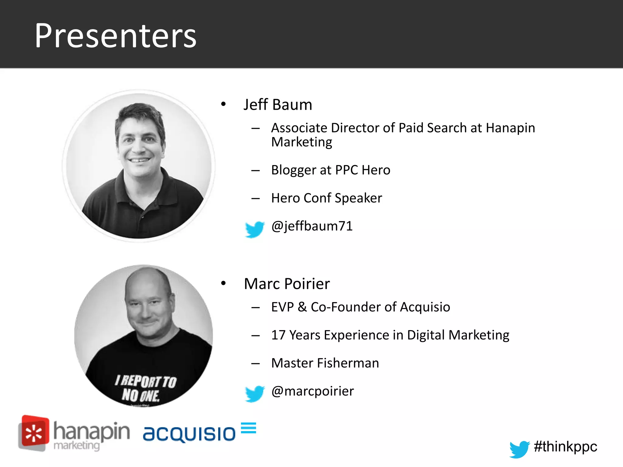 The document outlines nine automation hacks for recovering from the holidays in PPC campaigns, highlighting the importance of scripts, creative testing, call tracking, experiments, CRM integration, automated rules, GDN management, macros, and overall automation. It emphasizes the efficiency and effectiveness of using these automation techniques to optimize PPC performance and manage accounts more effectively. The content is part of a webinar hosted by PPC experts Jeff Baum and Marc Poirier, which includes interactive polls and resources for attendees.