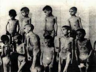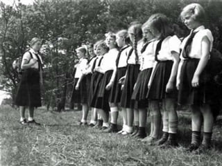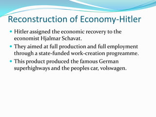 The document provides information on how Hitler and the Nazis utilized various aspects of society and government to consolidate power and propagate their racist ideology. It discusses how Hitler assigned economic recovery to Hjalmar Schacht and aimed for full production and employment through public works programs, resulting in infrastructure projects. It also describes how the Nazis reorganized education, youth groups, women's roles, language and the media to indoctrinate the populace, especially children, with Nazi ideals of Aryan supremacy and anti-Semitism. All dissent was purged and society was tightly controlled and mobilized for Hitler's goals of war and racial conquest in Europe.