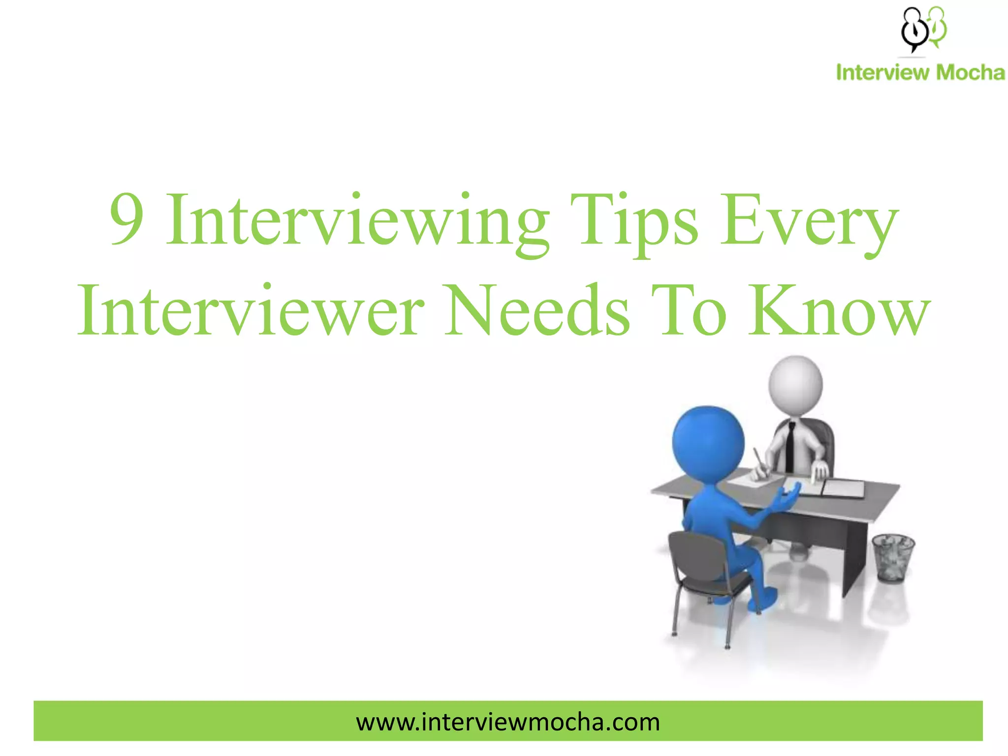 The document outlines nine essential interviewing tips to help interviewers effectively evaluate candidates and improve hiring outcomes. Key advice includes avoiding biased first impressions, understanding candidates' motivations, and using pre-employment skills testing to save time. By implementing these strategies, interviewers can enhance their decision-making and identify top performers more efficiently.