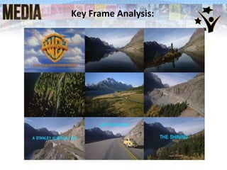 This document analyzes the opening title sequence of a film frame by frame. It describes 9 key frames that set the scene and introduce important elements. Frame 1 shows the production company logo. Frames 2-3 use long shots to depict the setting around a lake and island. Frame 4 switches to an aerial view of forests and reveals the camera is following a car on a road. Frames 5-6 continue tracking the car in different locations to give a sense of distance traveled. Frame 7 introduces the director's name while still tracking the car. Frame 8 provides a closer look at the car, and Frame 9 reveals the film title as the camera pans over the landscape. Throughout, the camera constantly tracks the car to make the viewer