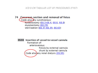 Dokumen ini membahas prinsip-prinsip koding prosedur medis oleh Dr. Lily Kresnowati, seperti pentingnya mendokumentasikan semua prosedur signifikan dari admisi hingga discharge dan metode untuk mengkode laporan operasi. Ada penjelasan mengenai pembatalan prosedur, instruksi 'code also', dan 'omit code'. Koder juga harus memverifikasi diagnosis dengan laporan patologi dan mendiskusikan setiap perbedaan antara diagnosis yang ada.
