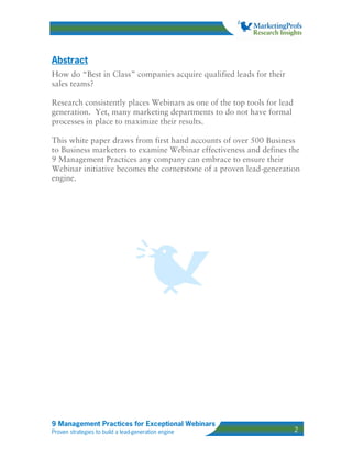 This document outlines nine management practices that companies can adopt to enhance the effectiveness of their webinars as tools for lead generation. Based on research and firsthand accounts from over 500 B2B marketers, the practices focus on team assembly, aligning with sales, strategic content development, and measuring success. These practices aim to help organizations effectively leverage webinars to generate leads, nurture prospects, and achieve broader marketing objectives.