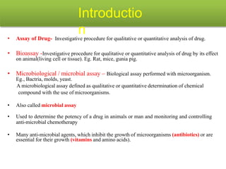 This document describes the process of microbiological assay, specifically as it relates to antibiotics and vitamins. There are two main methods described - the cylinder plate method and the turbidimetric tube assay method. For both methods, standard and test solutions are prepared along with appropriate culture media and test organisms. Zones of inhibition are measured for the cylinder plate method to determine potency, while growth is measured spectrometrically for the turbidimetric tube assay method. Requirements, procedures, and interpretation of results are provided for microbiological assay of both antibiotics and specific vitamins like vitamin B12.