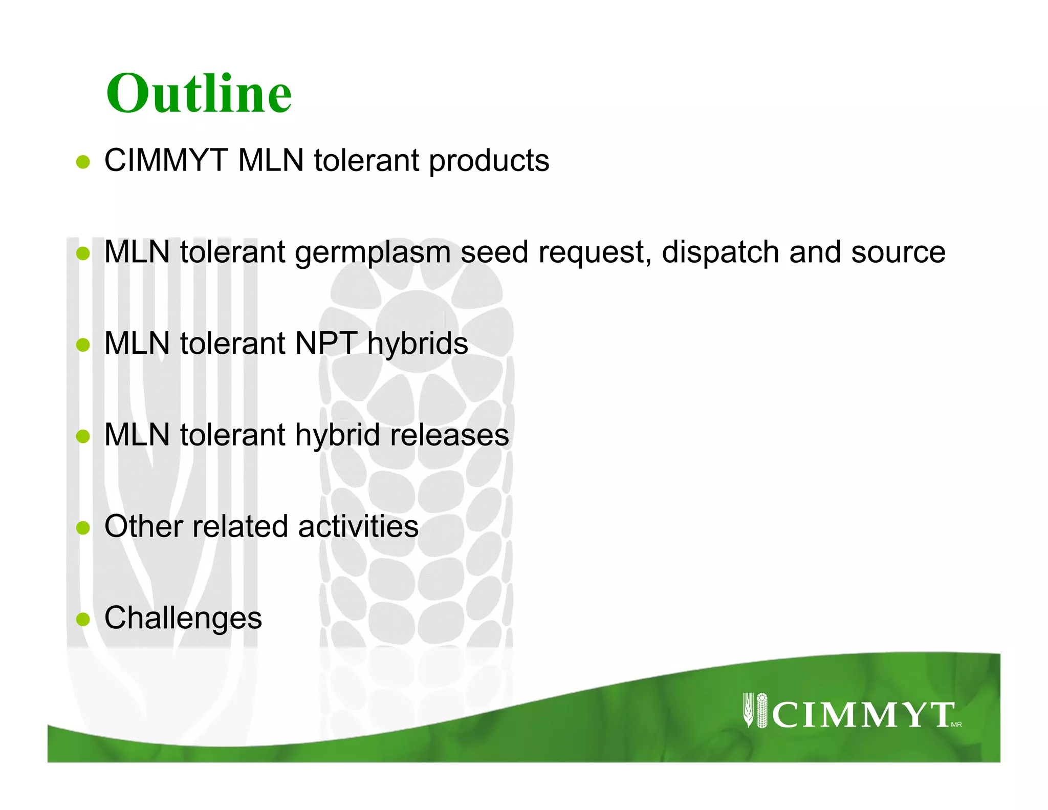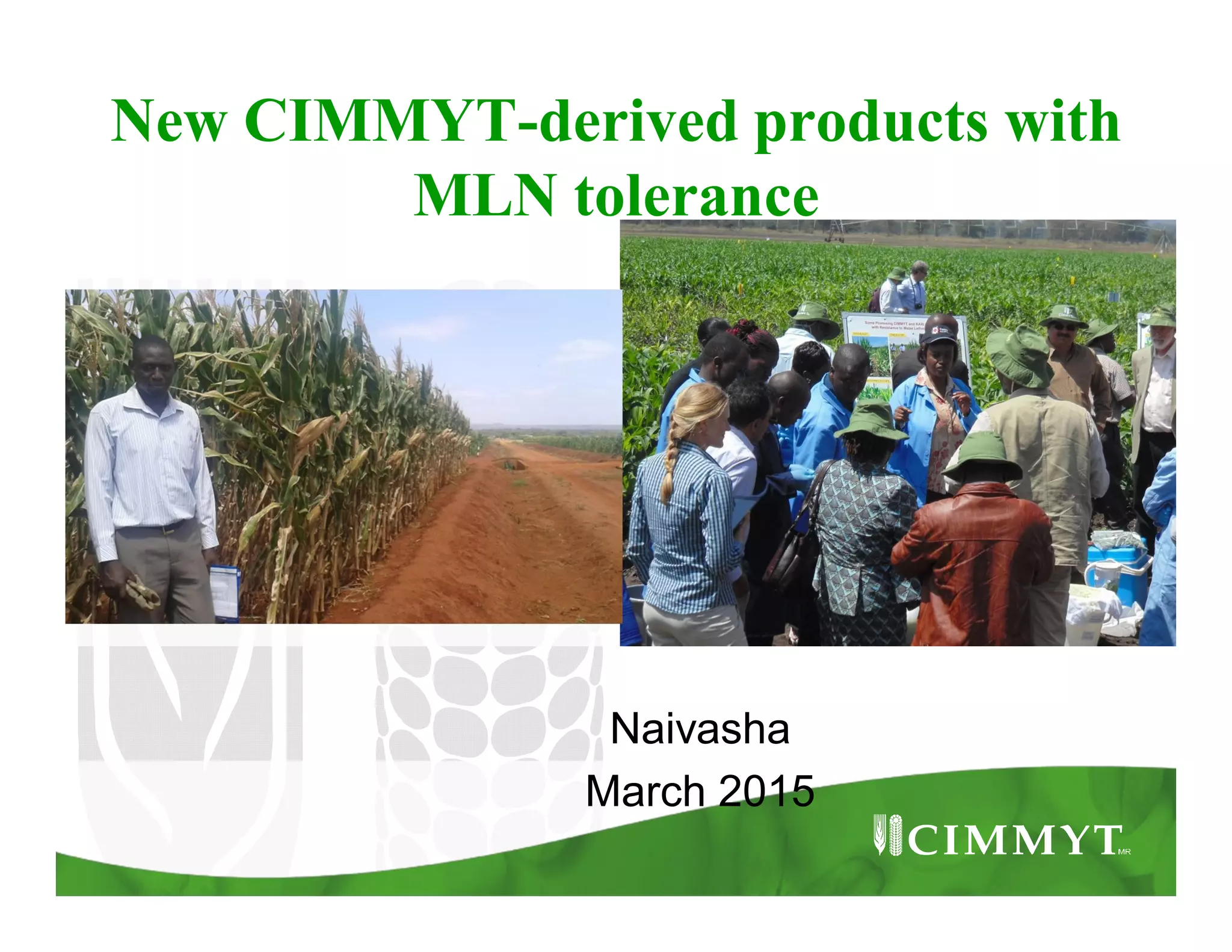 This document provides an update on CIMMYT's maize products that are tolerant to maize lethal necrosis (MLN). It discusses MLN tolerant germplasm that has been distributed to various countries in East and Southern Africa. Some MLN tolerant hybrids have entered national performance trials in Kenya, Tanzania, and Uganda and have shown moderate tolerance to MLN. Five hybrids have been recommended for release or already released in Kenya, Uganda, and Tanzania. Challenges remain in developing parents that are all resistant to MLN and in finding MLN-free areas for seed production. Overall, progress is being made in developing and distributing MLN tolerant maize varieties and hybrids to countries affected by the disease