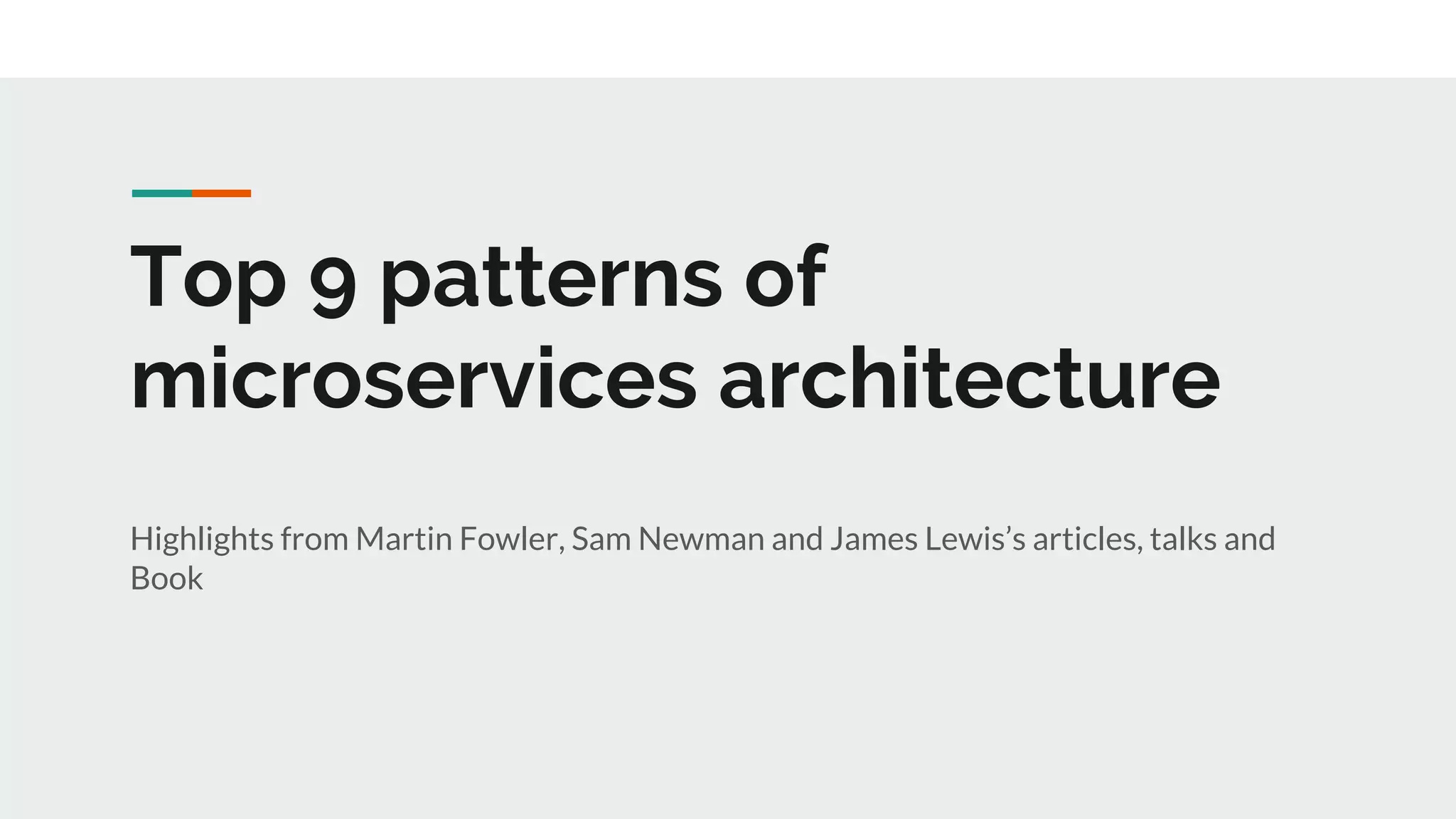 2. Key patterns include organizing around business capabilities with cross-functional teams, treating services as long-running products rather than projects, using smart endpoints and dumb pipes for communication, and decentralized governance and data management.
