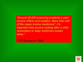 1) Around 30,000 poisoning incidents per year involve young children under age 2, over half of which are caused by accidental ingestion of medicines that were improperly stored.