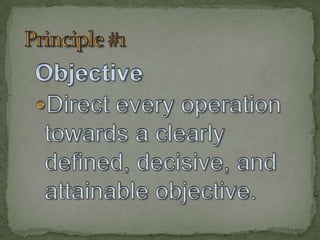 The document outlines the 9 principles of war as defined in the Army Field Manual 22-100, applicable to military leadership, business, and information security. These principles emphasize objectives, offensive strategies, economy of force, mass, surprise, maneuver, unity of command, security, and simplicity in planning. It includes quotations reflecting the importance of audacity and strategic thinking in achieving goals.