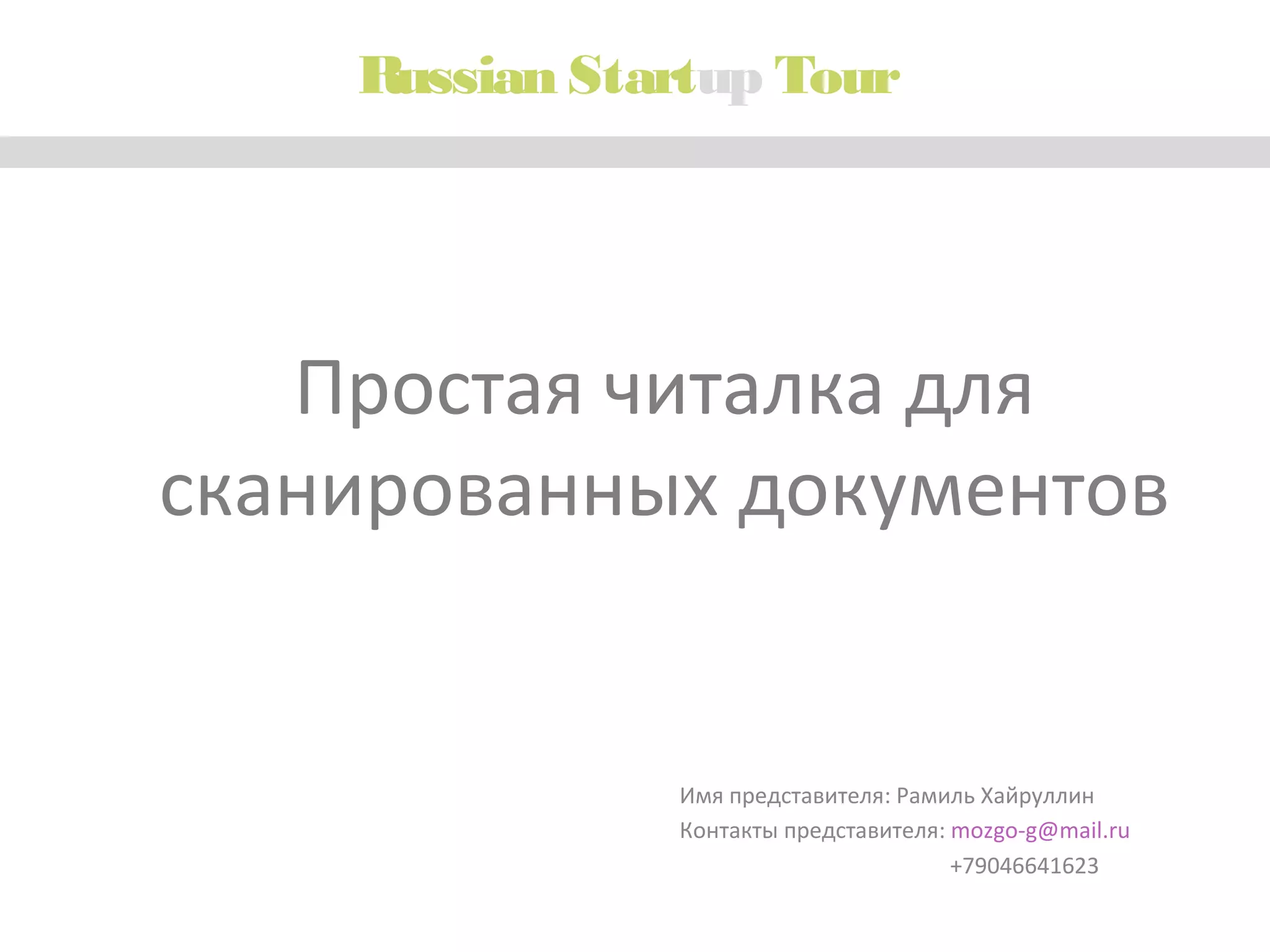 Документ описывает стартап 'Reflow Reader', который предлагает уникальную технологию для удобного чтения сканированных документов на мобильных устройствах, устраняя необходимость прокрутки влево и вправо. Команда, состоящая из студентов Казанского государственного университета, планирует реализовать проект в течение 4-6 месяцев с бюджетом в 30,000 долларов. Главные покупатели приложения - студенты, читатели и бизнесмены, для которых разработано простое и доступное решение на базе мобильного приложения.