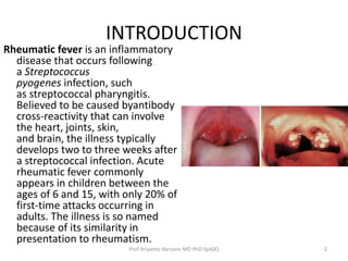 Rheumatic fever is an inflammatory disease that occurs following a streptococcal throat infection. It is believed to be caused by an autoimmune response where antibodies generated to fight the streptococcal infection cross-react with tissues in the heart, joints, skin, and brain. This causes inflammation and damage, particularly to the heart valves. If not properly treated, rheumatic fever can lead to chronic rheumatic heart disease where repeated valve damage and scarring occurs.