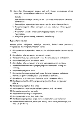 Rencana pelaksanaan pembelajaran (RPP) ini membahas tentang alat optik seperti mata, cermin, lensa, kaca pembesar, mikroskop dan teleskop. RPP ini menjelaskan bagian-bagian dan fungsi mata serta cara kerja berbagai alat optik tersebut dengan menggunakan prinsip-prinsip dasar optika seperti pemantulan dan pembiasan cahaya.