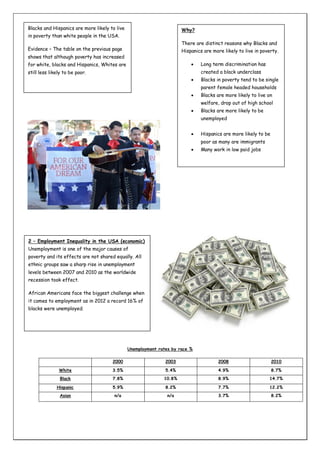 The document discusses several areas of social and economic inequality in the USA, including wealth, employment, health, education, housing, and crime. It provides evidence that ethnic minorities such as Black and Hispanic Americans face significantly higher rates of poverty, unemployment, lack of health insurance, lower life expectancy, higher school dropout rates, lower home ownership, and higher rates of incarceration when compared to white Americans. The inequalities are linked to issues of discrimination, unequal access to resources and opportunities, and concentration of minorities in low-income urban areas with underfunded public services and higher crime rates.