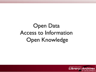 The World Bank is changing to become more open through increased access to information and open data. It has implemented a new access to information policy that presumes information disclosure by default. It has also launched an open data portal containing over 7,000 indicators from 6 million visitors in 5 languages. The institution is digitizing its records to improve transparency, accountability and innovation through open knowledge sharing. It will launch an open knowledge repository in 2012 to curate and provide open access to Bank research and publications.