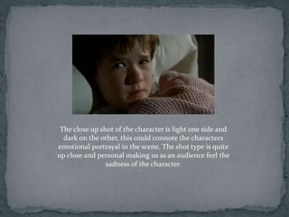 This document analyzes 9 different shots from a film and discusses the purpose and meaning conveyed by different camera angles, lighting techniques, settings, and character positioning in each shot. The shots include a close up of a character's face using light and shadow to convey emotion, an over the shoulder shot that makes the audience feel like they are eavesdropping on a conversation, and a wide establishing shot that zooms in to show characters and set the scene.