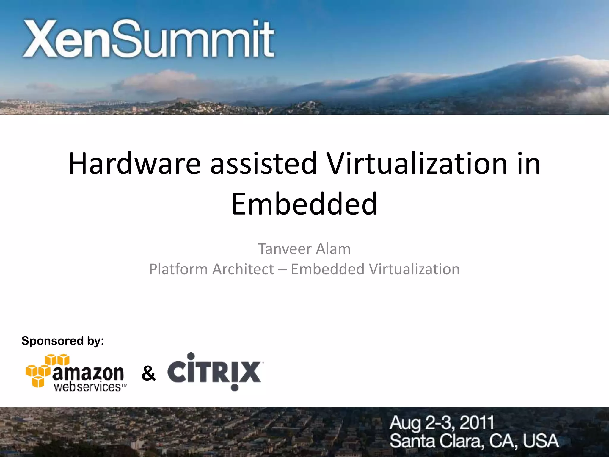This document discusses hardware-assisted virtualization in embedded systems and provides examples. It begins with an overview of embedded virtualization requirements and key use cases. It then reviews Intel virtualization technology features like EPT and VT-d. Examples shown include a retail digital signage soft failover proof of concept using Xen virtualization and a medical critical OS isolation proof of concept separating real-time and standard functions. The document promotes virtualization for consolidation, isolation and robustness in embedded applications.