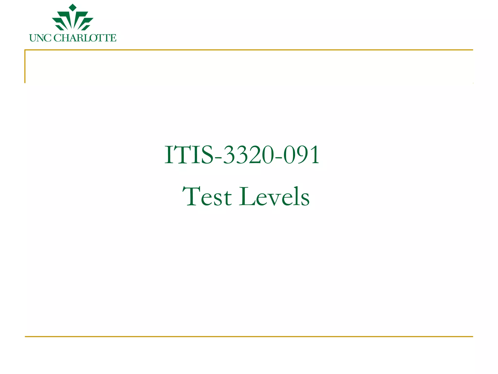 This document discusses different levels of software testing including component tests, integration tests, system tests, and acceptance tests. It describes the test object, objectives, reference materials, entry and exit criteria for each level. Component tests focus on individual modules, integration tests check interfaces between components, system tests evaluate the fully integrated system, and acceptance tests determine if the software meets user requirements.