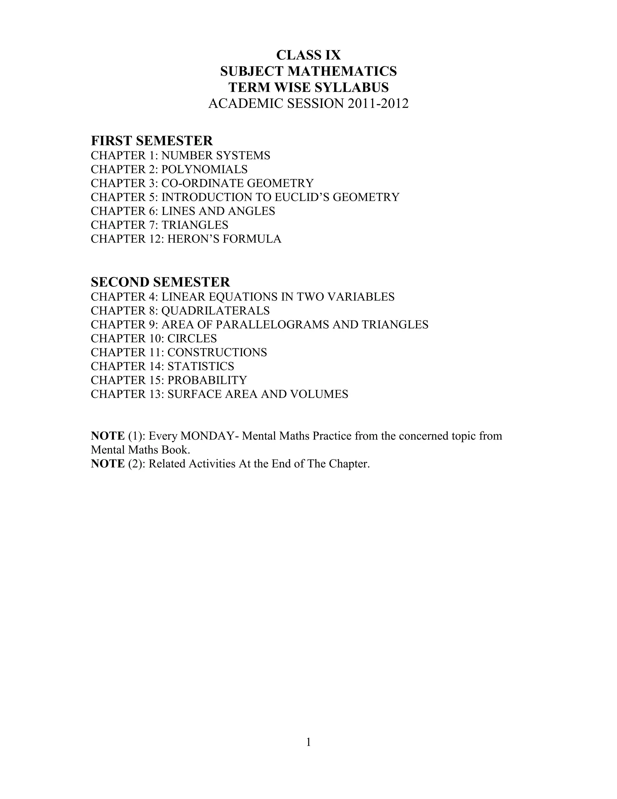 The document outlines the syllabus for Class IX mathematics for the academic session 2011-2012. It is divided into two semesters. The first semester covers chapters on number systems, polynomials, coordinate geometry, introduction to Euclid's geometry, lines and angles, triangles, and Heron's formula. The second semester covers chapters on linear equations in two variables, quadrilaterals, areas of parallelograms and triangles, circles, constructions, statistics, probability, and surface areas and volumes. Mental maths practice is scheduled every Monday based on the concerned topic. Related activities are provided at the end of each chapter.