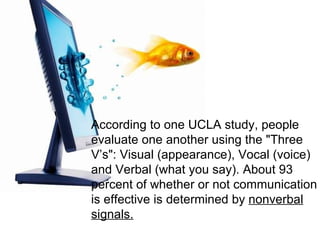 The document provides tips for making a positive first impression during a job interview. It discusses how people are evaluated in the first 30 seconds based on their nonverbal communication like appearance, body language, eye contact and handshake. The tips include dressing professionally, sitting up straight, making eye contact, having a firm handshake, speaking confidently and avoiding unprofessional behaviors like using silly email addresses or not preparing for interviews.