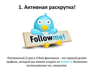 Доклад предлагает 9 способов увеличения трафика с Twitter, включая активную раскрутку, общение, создание качественного контента и использование открытых списков. Рекомендуется регулярное взаимодействие с аудиторией и оптимизация времени публикации твитов для максимальной эффективности. Также акцентируется важность дружелюбного подхода и благодарности к подписчикам.