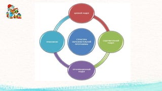 Цели и задачипрограммы Цель и задачи деятельности ЦРР по реализации ООП определены на основании ФГОС, совмещения программ «Детство» и «Открытия», потребностей детей и родителей, социума, в котором находится ЦРР. Цель реализации ООП – разносторонне и целостно развивать ребенка, обеспечивая формирование общей культуры, развитие физических, интеллектуальных и личностных качеств. Задачи ООП: • Обеспечить охрану и укрепление физического и психического здоровья детей, их эмоциональное благополучие. • Создать благоприятные условия для развития интеллектуальных и творческих возможностей детей. • Обеспечить равный доступ к образованию всех воспитанников ЦРР с учетом разнообразия особых образовательных потребностей и индивидуальных возможностей. • Формировать интеллектуальный потенциал детей, развивать познавательную активность, любознательность, стремление к самостоятельному познанию и размышлению через реализацию парциальных программ и технологий. • Создавать условия для вовлечения семьи в образовательный процесс ЦРР, уважая и поддерживая все формы участия семей и местного сообщества в образовании детей.