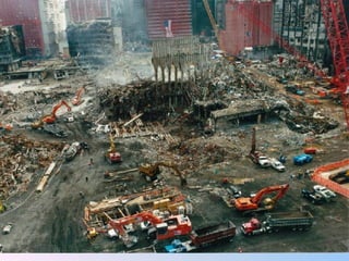 The document discusses aerial photos taken on September 11, 2001 during the terrorist attacks on the World Trade Center. The photos were likely captured from a military helicopter and contain images from 9/11 that have not been widely shared online. While some may want to forget the events, the author believes it is important to reawaken memories of that day through sharing the photos more widely.