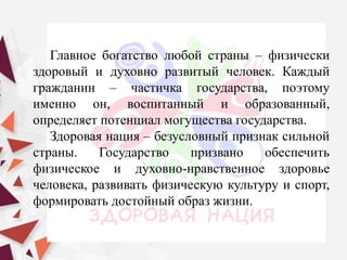 Документ подчеркивает важность здорового образа жизни для создания физически здоровой и морально развитой нации. В нем изложены основные аспекты здоровья, принципы здорового образа жизни и негативные последствия вредных привычек, таких как курение и алкоголизм. Также акцентируется внимание на роли государства в формировании культуры здоровья и воспитании граждан, способных противостоять негативным воздействиям.