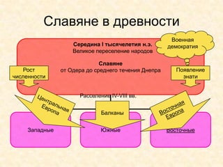 Документ описывает историю славян в I тысячелетии н.э., их военные союзы и социальную структуру, подчеркивая развитие древнерусского государства в IX-XII веках. Основные моменты включают образование племенных союзов, внедрение христианства, феодальную раздробленность и воздействие монголо-татар на Русь. Также рассматривается вклад ключевых персонажей, таких как князь Владимир и княгиня Ольга, в формирование политической и культурной жизни страны.