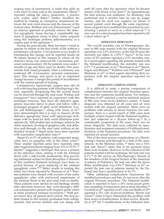 This review article summarizes the history and outcomes of treating Hirschsprung's disease. It describes how the cause was discovered in 1948 and the original Swenson procedure was developed. Over time, modifications like the Duhamel and Soave procedures were introduced. The article reviews diagnostic techniques, operative mortality rates, complications, and long-term outcomes for different surgical approaches. It finds that while modifications aimed to improve on the original Swenson procedure, they were associated with higher complication and reoperation rates compared to the original approach.
