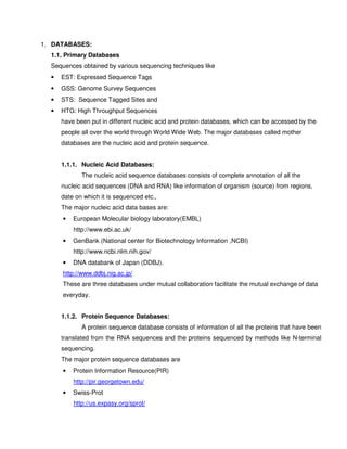 2. Major databases discussed include nucleic acid databases like GenBank, protein databases like Swiss-Prot, and structure databases like PDB. Secondary databases are derived from primary database information.