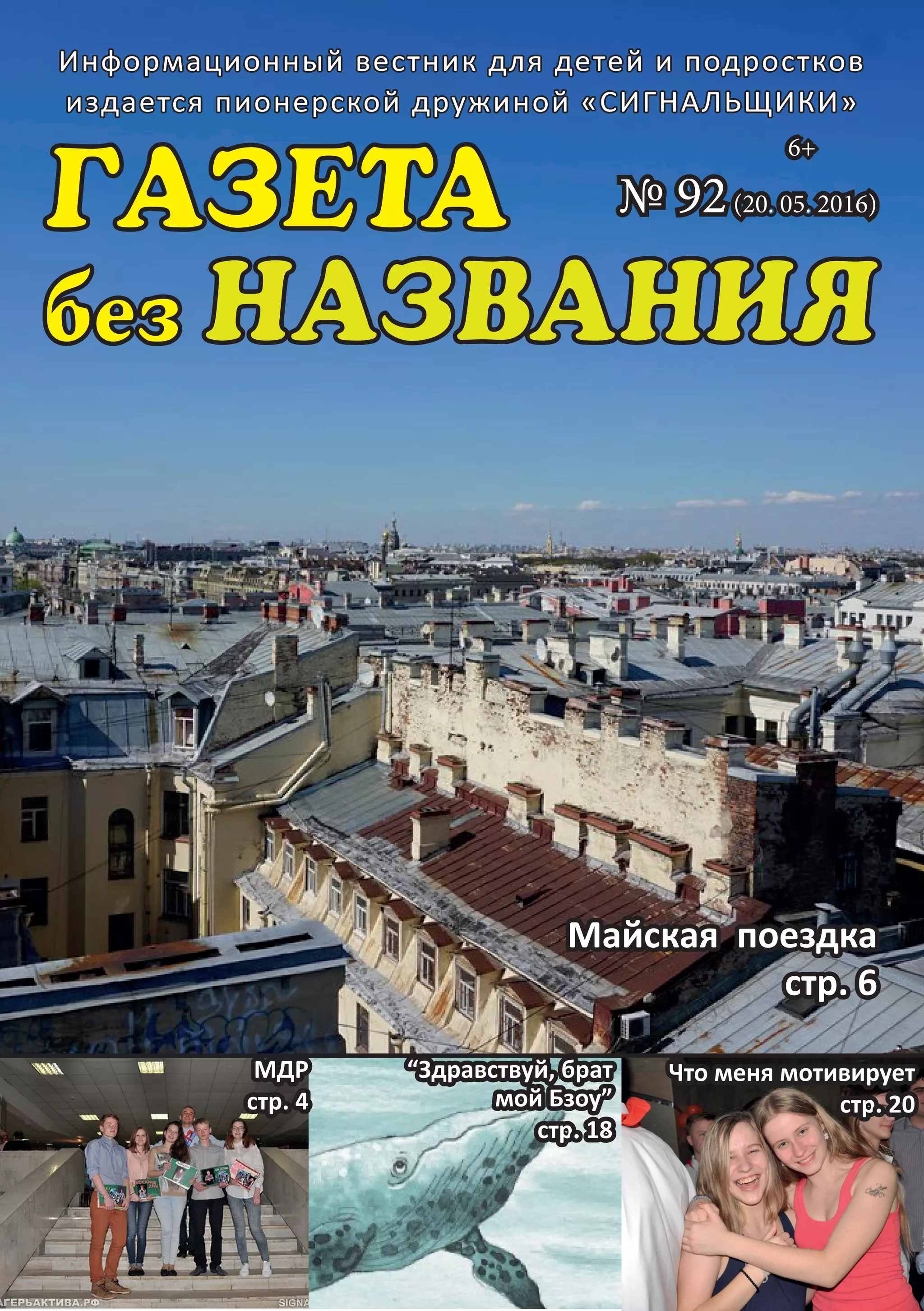 Документ представляет собой информационный вестник для детей и подростков, изданный пионерской дружиной «Сигнальщики» и содержит отчеты о мероприятиях, включая майские поездки, выпускные, и различные культурные события. В нем также освещаются мнения ребят о разных аспектах жизни в дружине, их мысли о мотивации и будущем. Вестник подчеркивает значимость сообществ и дружбы среди детей и подростков.